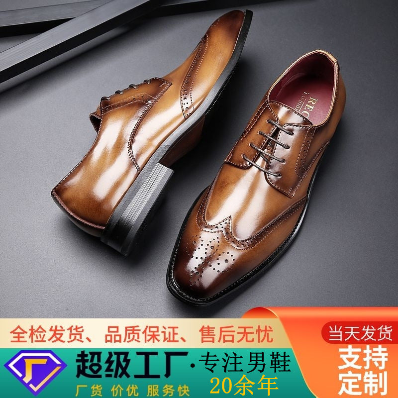 2024 New Carved Brogue British Genuine Leather Business Formal Shoes Men's Laced Derby Pointed Toe Youth HK81